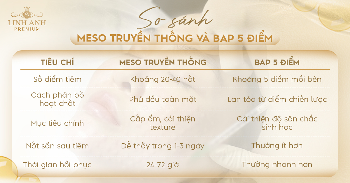 Nếu nói ngắn gọn thì Meso truyền thống và kỹ thuật BAP 5 điểm khác nhau chủ yếu ở số điểm tiêm, cách phân bố hoạt chất và trải nghiệm hồi phục sau tiêm. Meso truyền thống thường sử dụng 20–40 nốt tiêm vi điểm trên toàn mặt, trong khi kỹ thuật BAP chỉ tiêm khoảng 5 điểm chiến lược mỗi bên mặt. Vì vậy BAP thường ít nốt tiêm hơn và cảm giác hồi phục nhẹ hơn, nhưng mỗi kỹ thuật lại phù hợp với mục tiêu điều trị khác nhau.